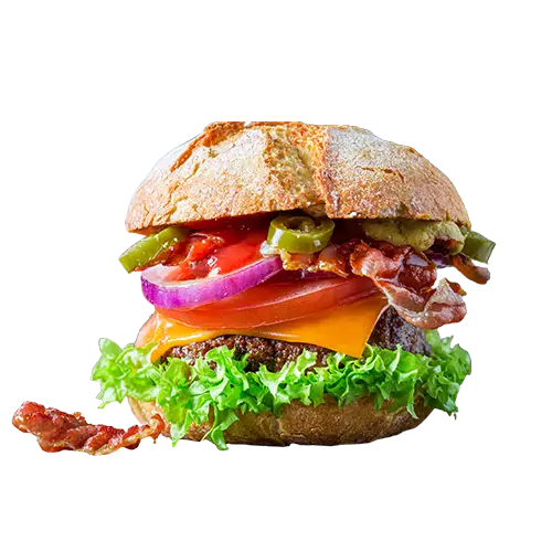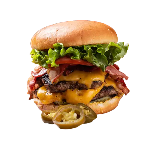 Doble carne, cheddar ahumado, cebolla caramelizada, bacon crujiente y salsa BBQ.